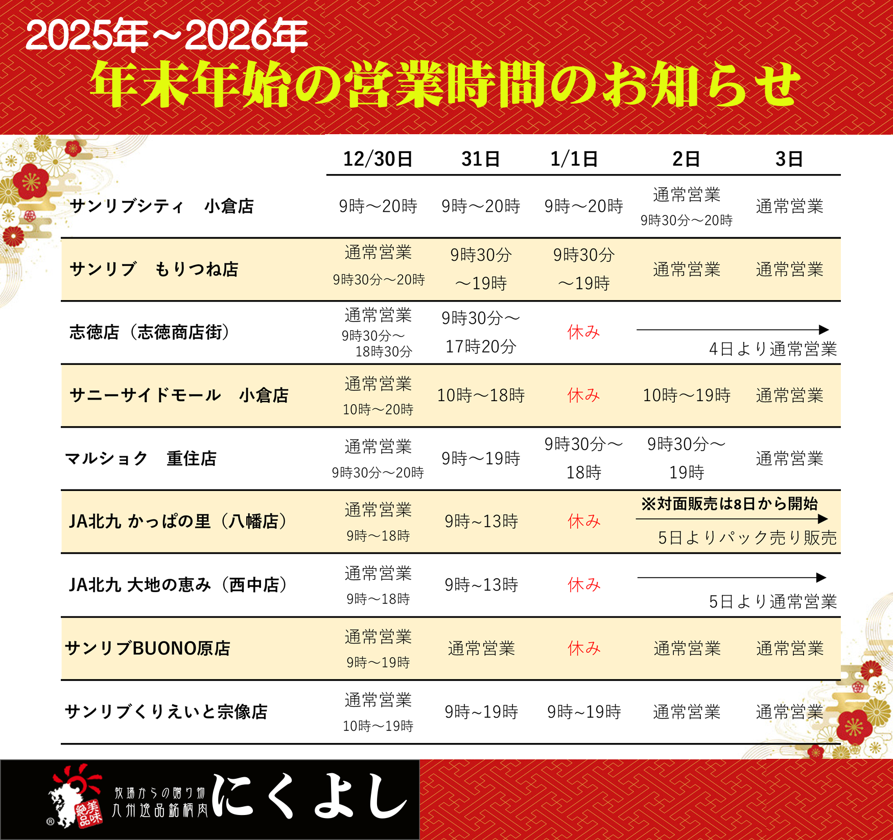 2025-2026年の年末年始の各店営業日ならびに営業時間は下記の通りとなっております。